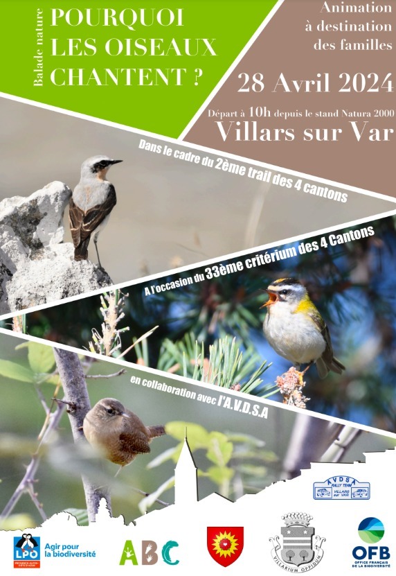 Agir pour la biodiversité! Rejoignez-nous au stand Natura 2000 pour une balade familiale à travers le Village de Villars sur Var sur le thème « Pourquoi les oiseaux chantent? »